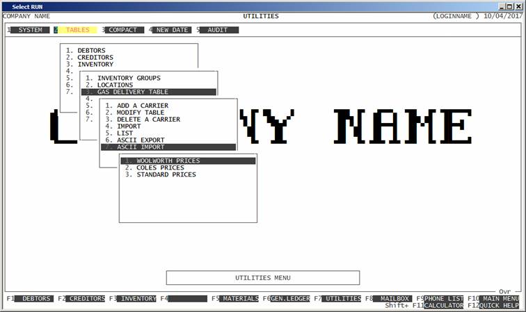 DELIVERY TABLE ASCII IMPORT MENU is accessed as item 7 from the GAS DELIVERY TABLE