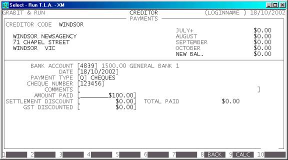 <ESC> To abort the whole transaction, press <ESC>. You will then be returned to the Creditor code